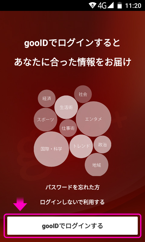 「g06ホーム」で「マイニュース」を表示するために「goo ID」でのログインが必要です。「goo IDでログインする」をタップします。